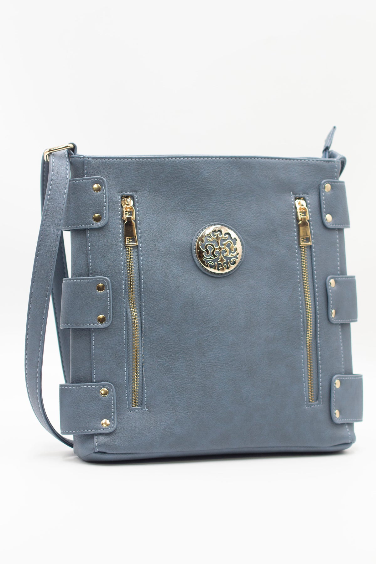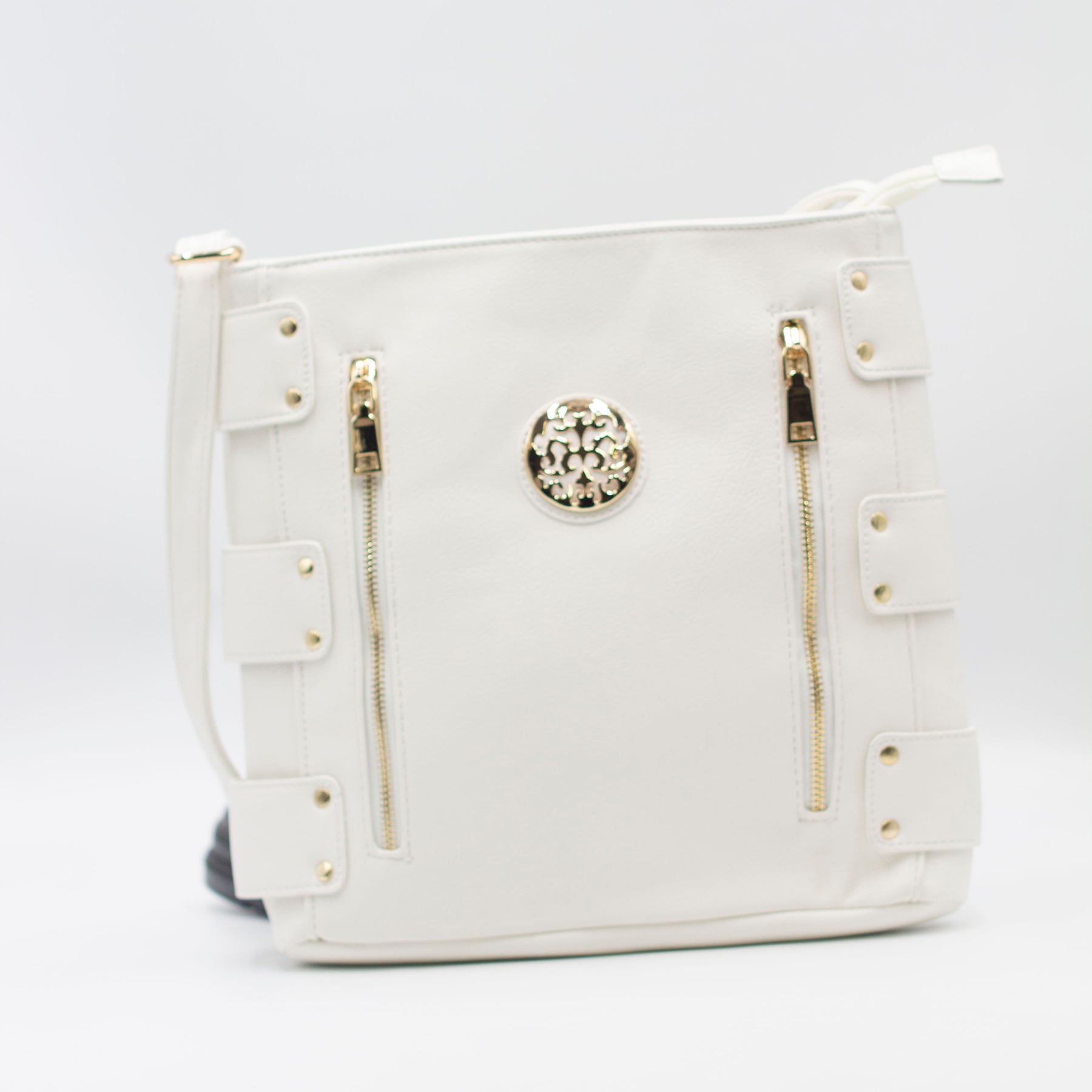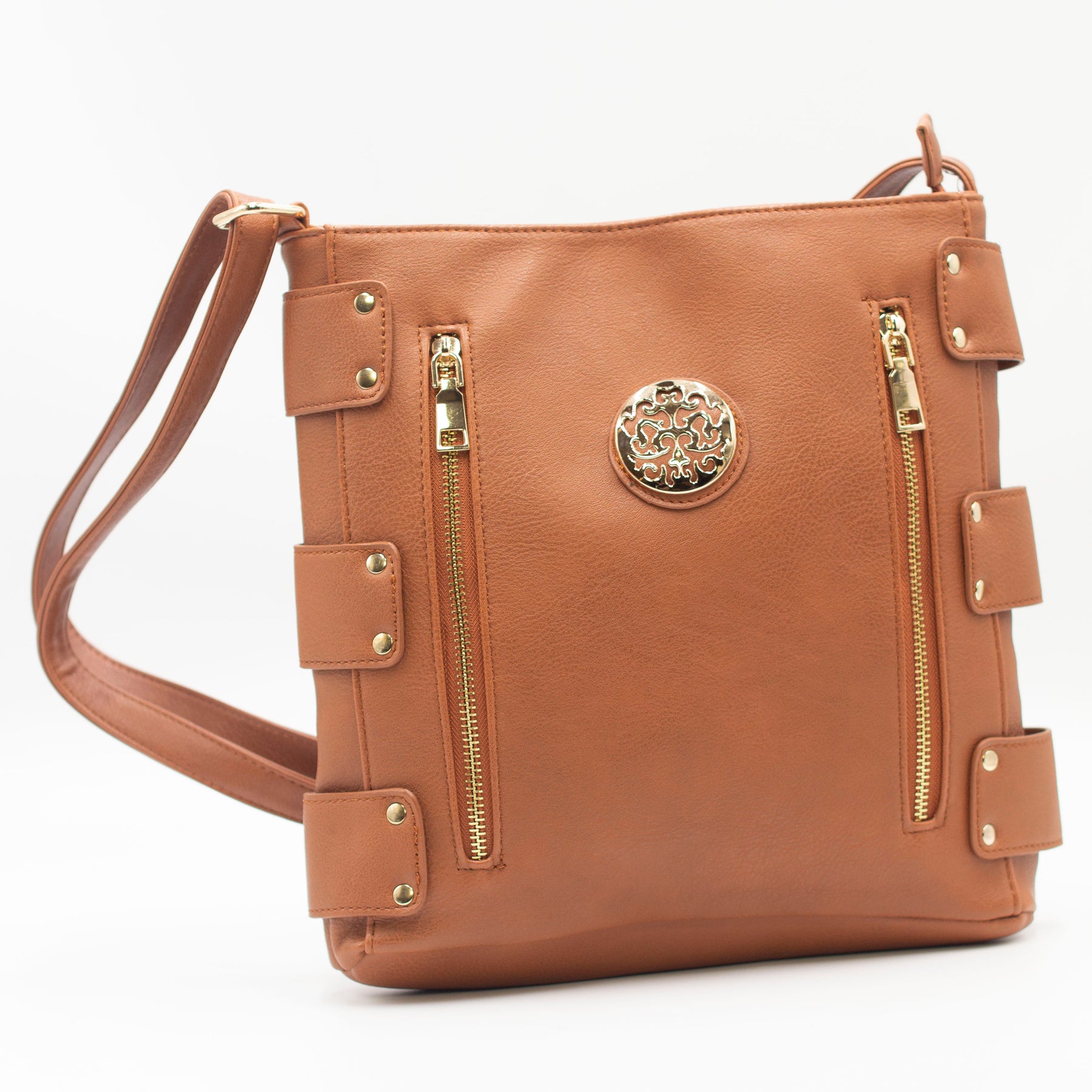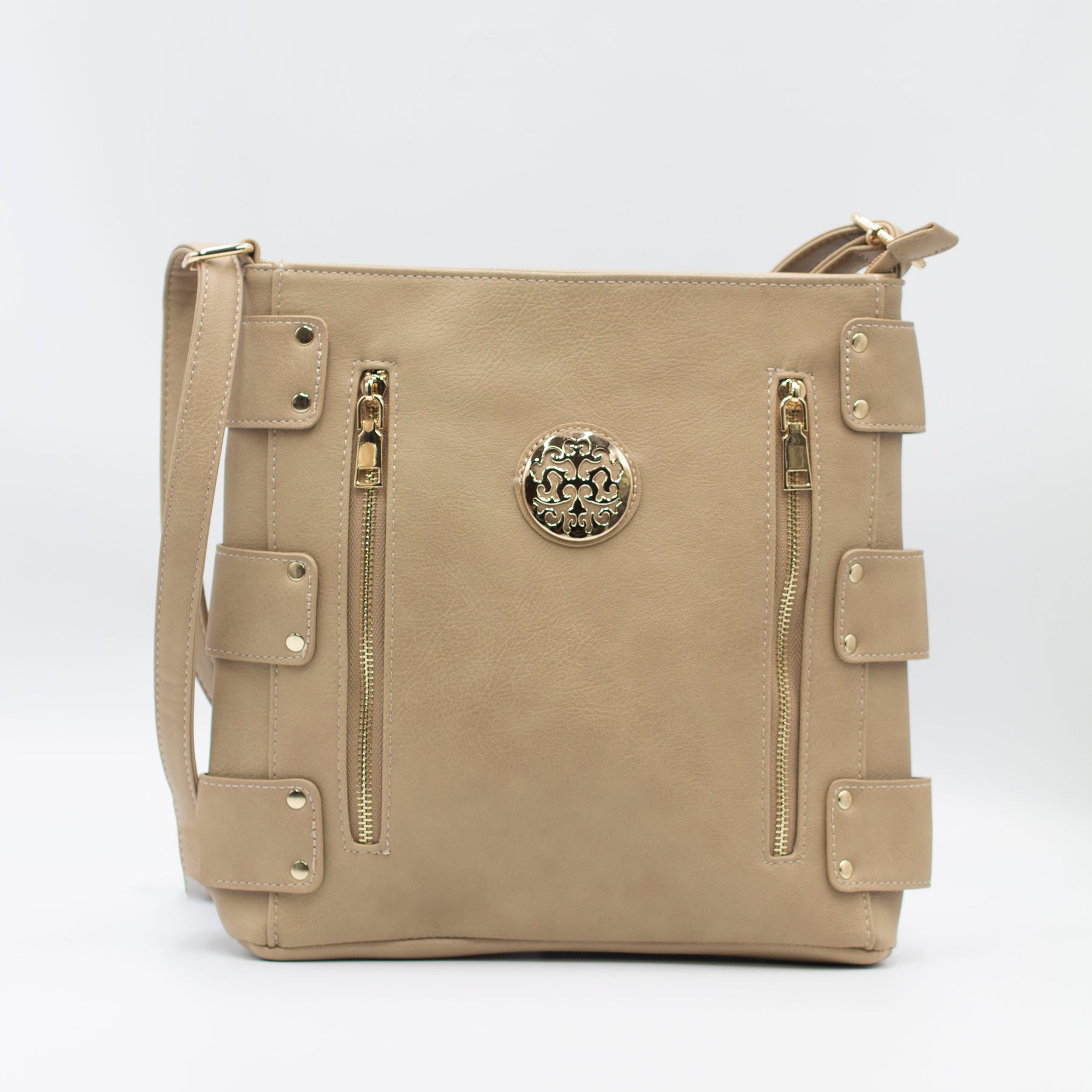 The SF217 - Regal Charm Shoulder Bag is a sophisticated blend of style and functionality, perfect for elevating your everyday look. With a structured design and high-quality material, this bag features two front zipper accents and unique side strap details, adding a touch of edginess. The eye-catching circular emblem on the front adds a subtle yet luxurious feel, while the gold-tone hardware gives it a polished finish.